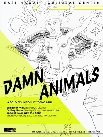 Brill has been exhibiting in Hilo, Honolulu, as well as venues in California and New York since 1993. His limited-edition book “Damn Animals (a coloring book for adults)” will be available for purchase at the EHCC gallery during his exhibition.