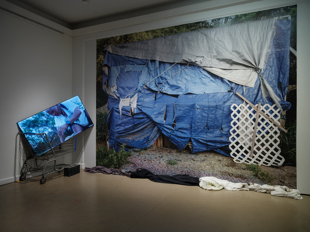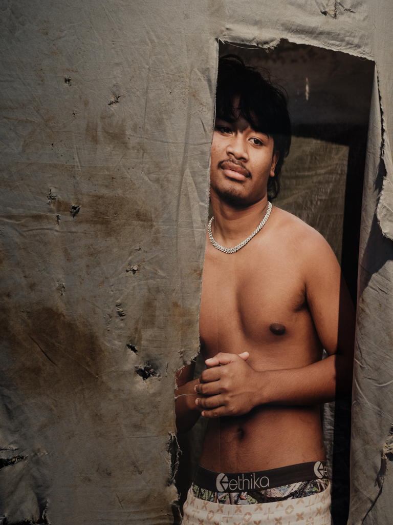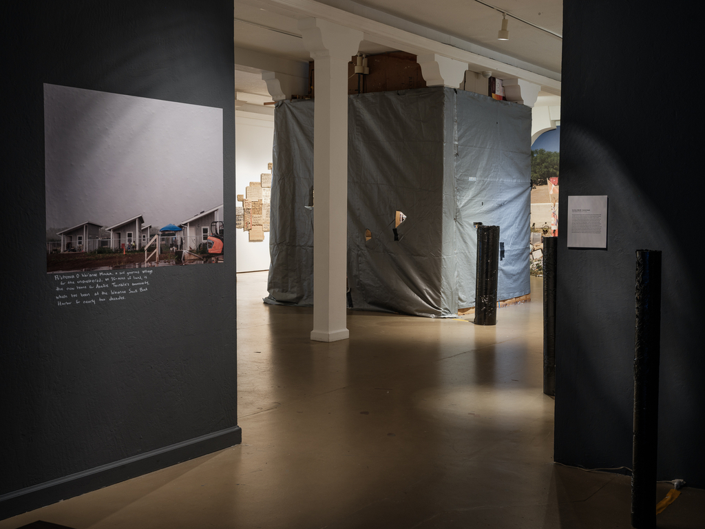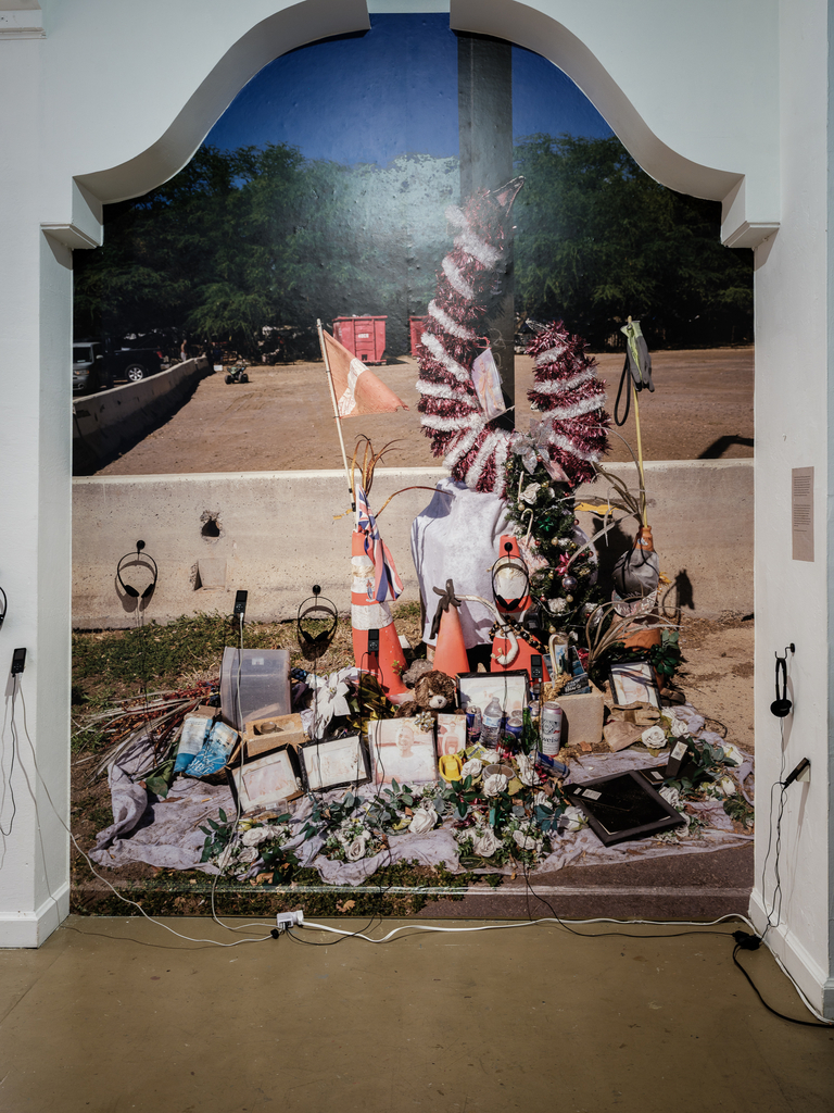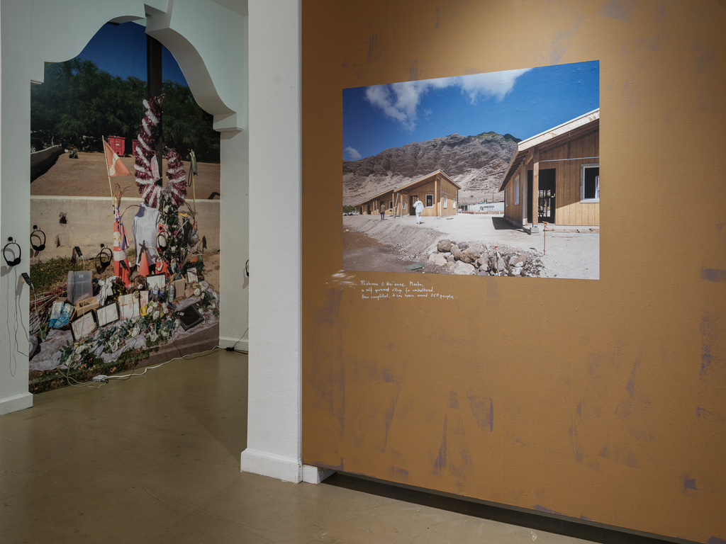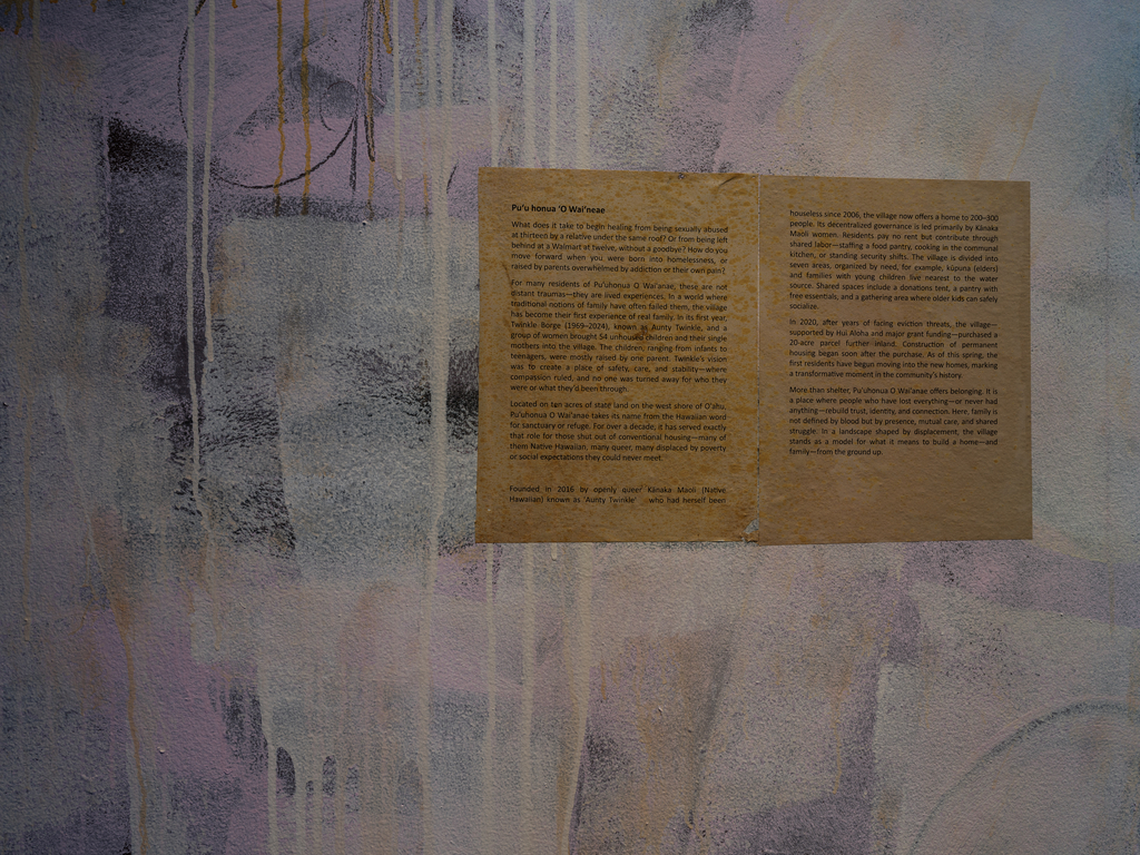 Photographs from Puʻuhonua O Waiʻanae complement the installations by Baronet and Orlowski, allowing residents there to show themselves as they wish to be seen. For over a decade, the community on ‘Oahu founded by Aunty Twinkle has served as a refuge and place of empowerment for those shut out of conventional housing—many of them Native Hawaiian, many queer, many displaced by poverty or social expectations they could never meet.