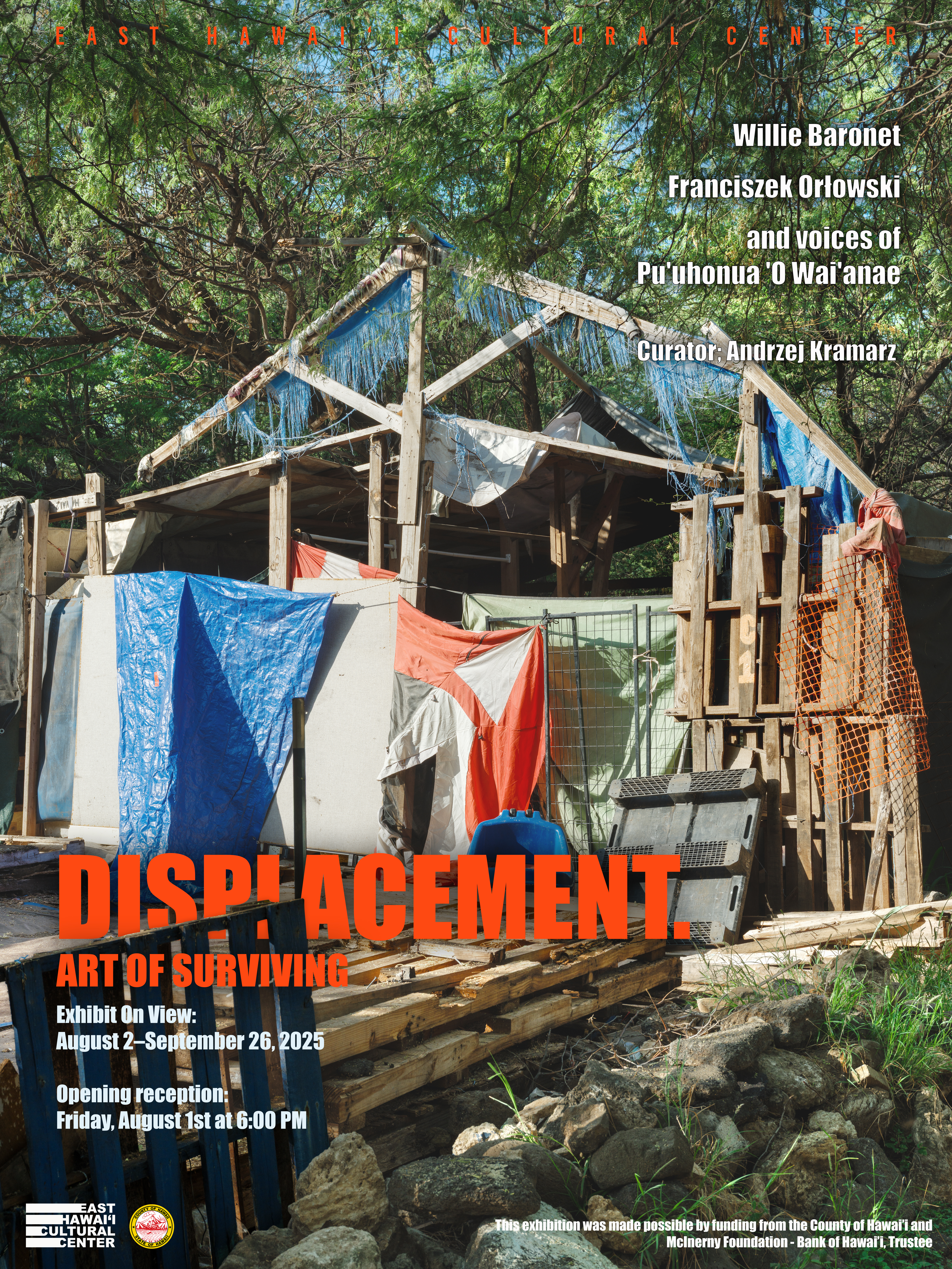 "Displacement. Art of Surviving", the exhibition on view at the East Hawai'i Cultural Center from August 2 through September 26, with an opening at 6pm on August 1, explores how two artists, Willie Baronet and Franciszek Orłowski, examine that question. It also features photos from Puʻuhonua O Waiʻanae, the sanctuary community founded by “Aunty Twinkle” (Twinkle Borge, 1969-2024).