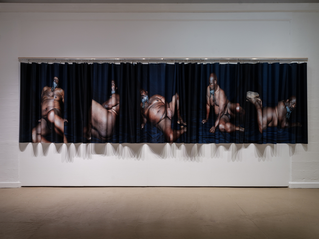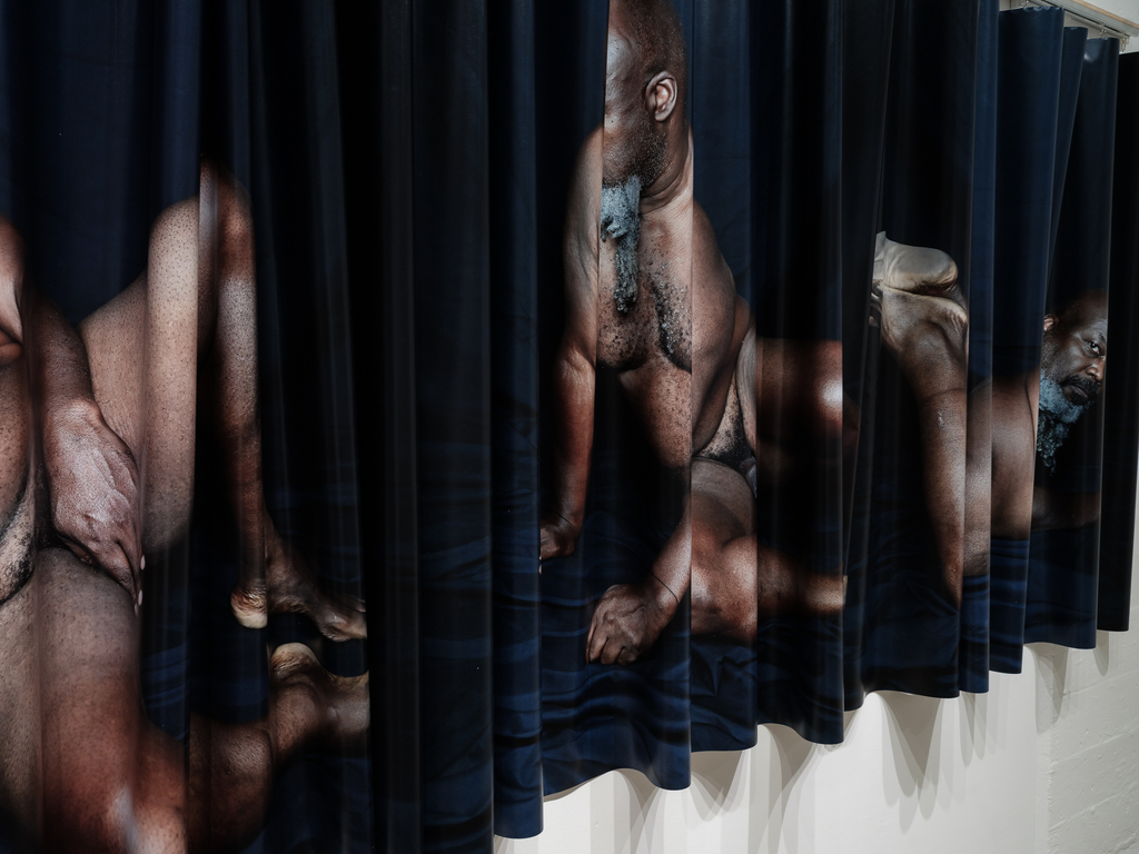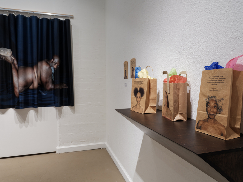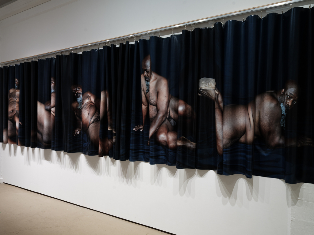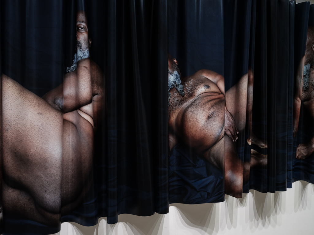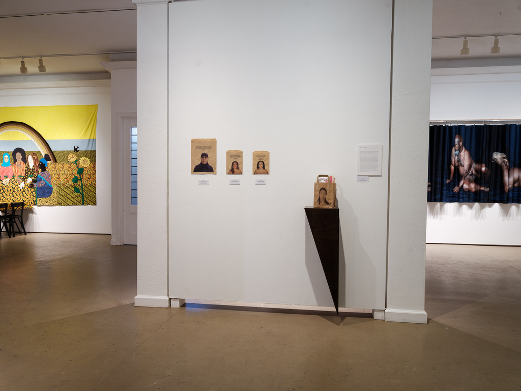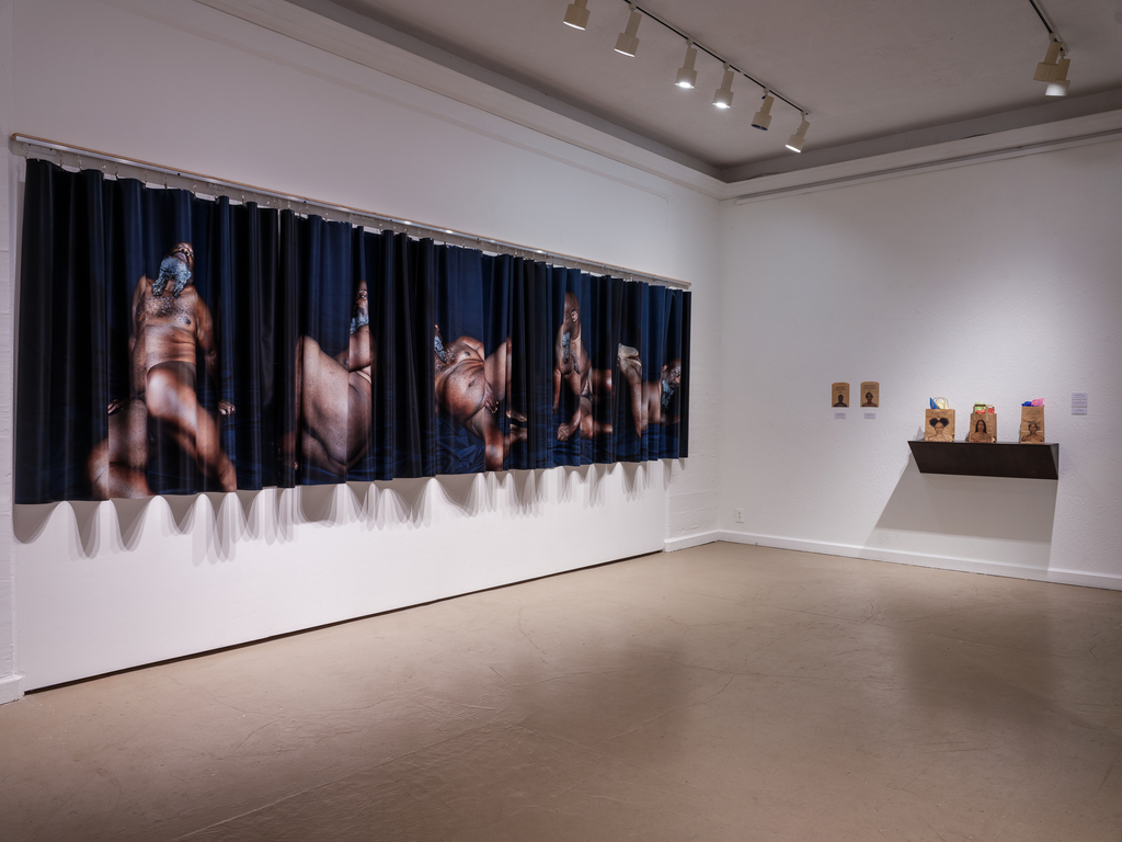 The exhibition encompasses a range of mediums, including photography, textile collage, video, drawings, and installations. Two of the artists employ their bodies in the art, asking viewers to examine their discomfort with what they see. Mitchell Squire is a former bodybuilder who started his plein-air self portraiture in 2020, exploring the socio-sexual effects of extractive economies and race, an effort that evolved through the COVID-19 pandemic and the rise of Black Lives Matter. He presents his increasing lack of fitness without apology.