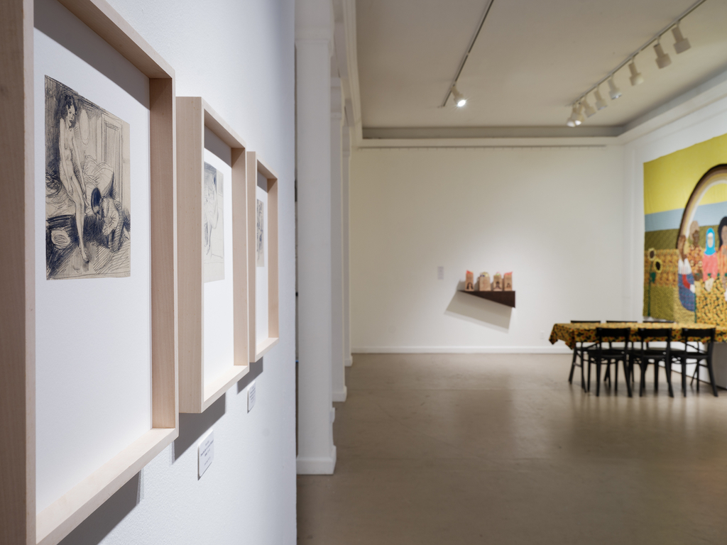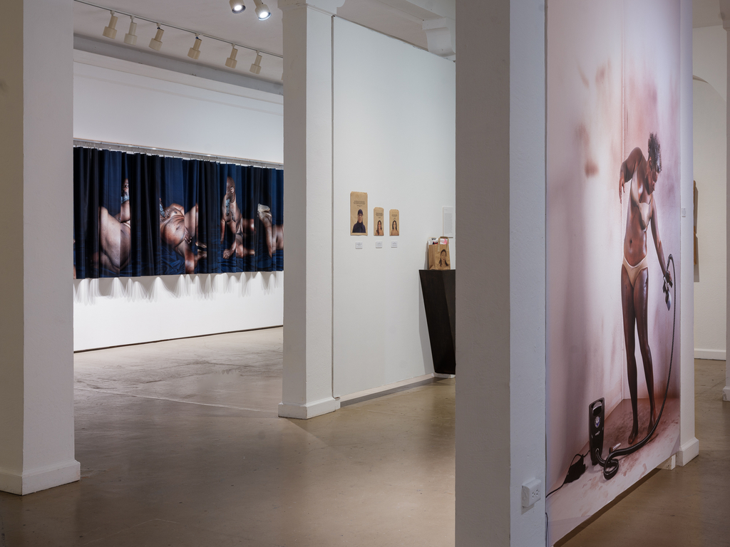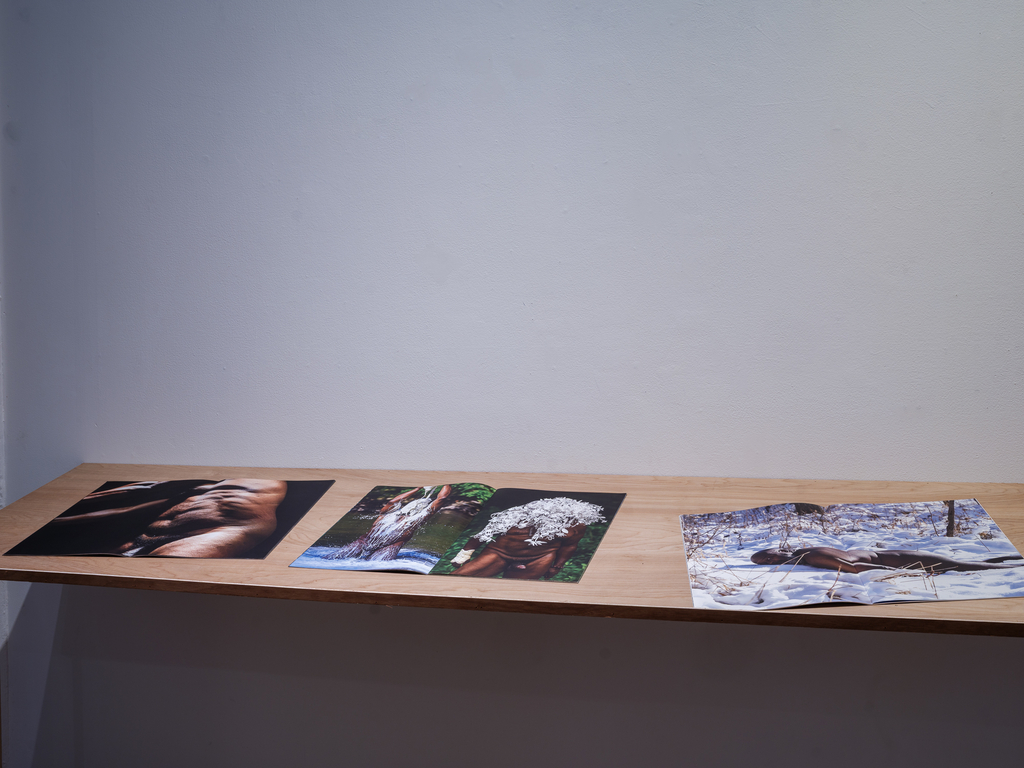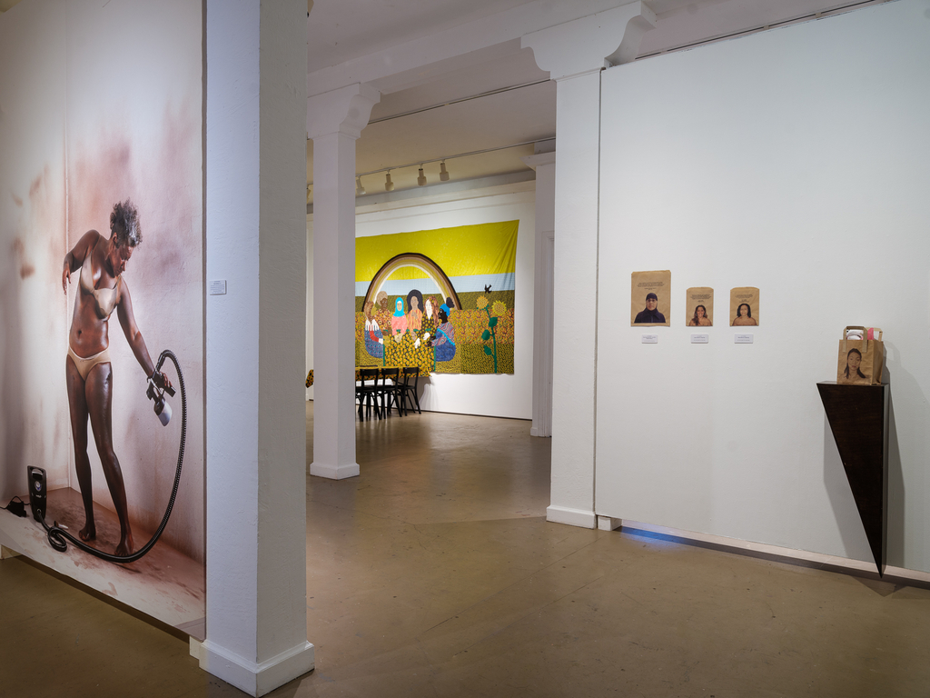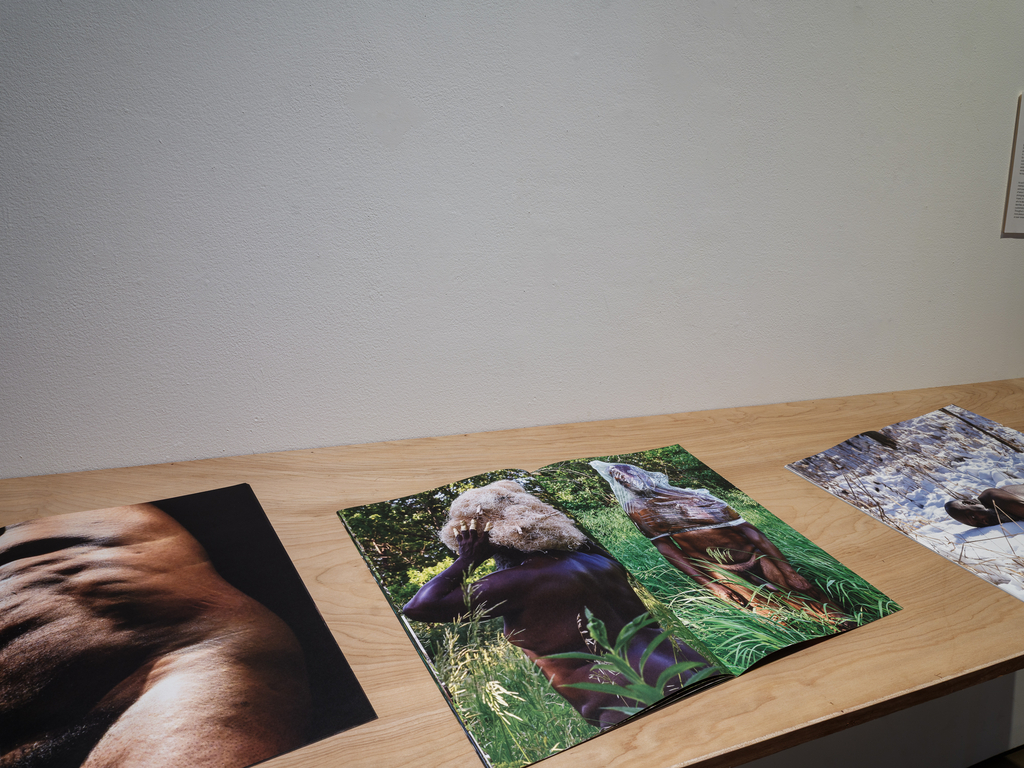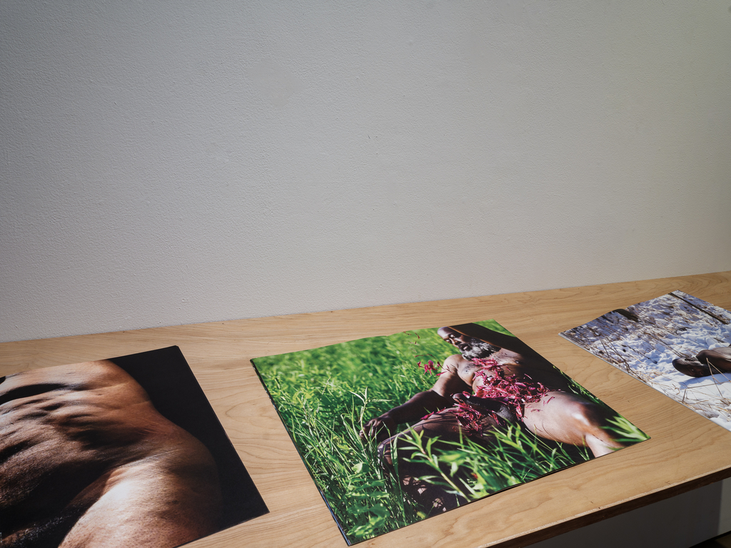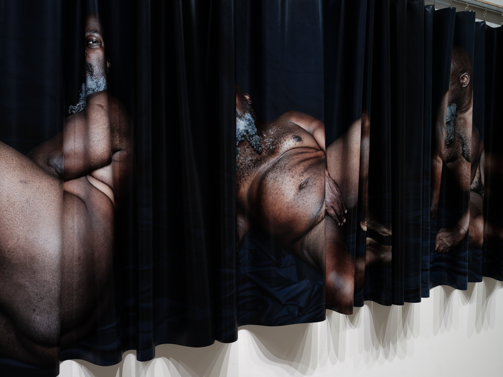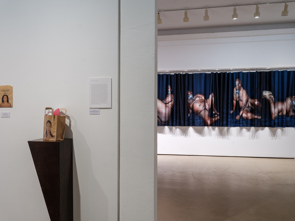 The exhibition encompasses a range of mediums, including photography, textile collage, video, drawings, and installations. Two of the artists employ their bodies in the art, asking viewers to examine their discomfort with what they see. Mitchell Squire is a former bodybuilder who started his plein-air self portraiture in 2020, exploring the socio-sexual effects of extractive economies and race, an effort that evolved through the COVID-19 pandemic and the rise of Black Lives Matter. He presents his increasing lack of fitness without apology.