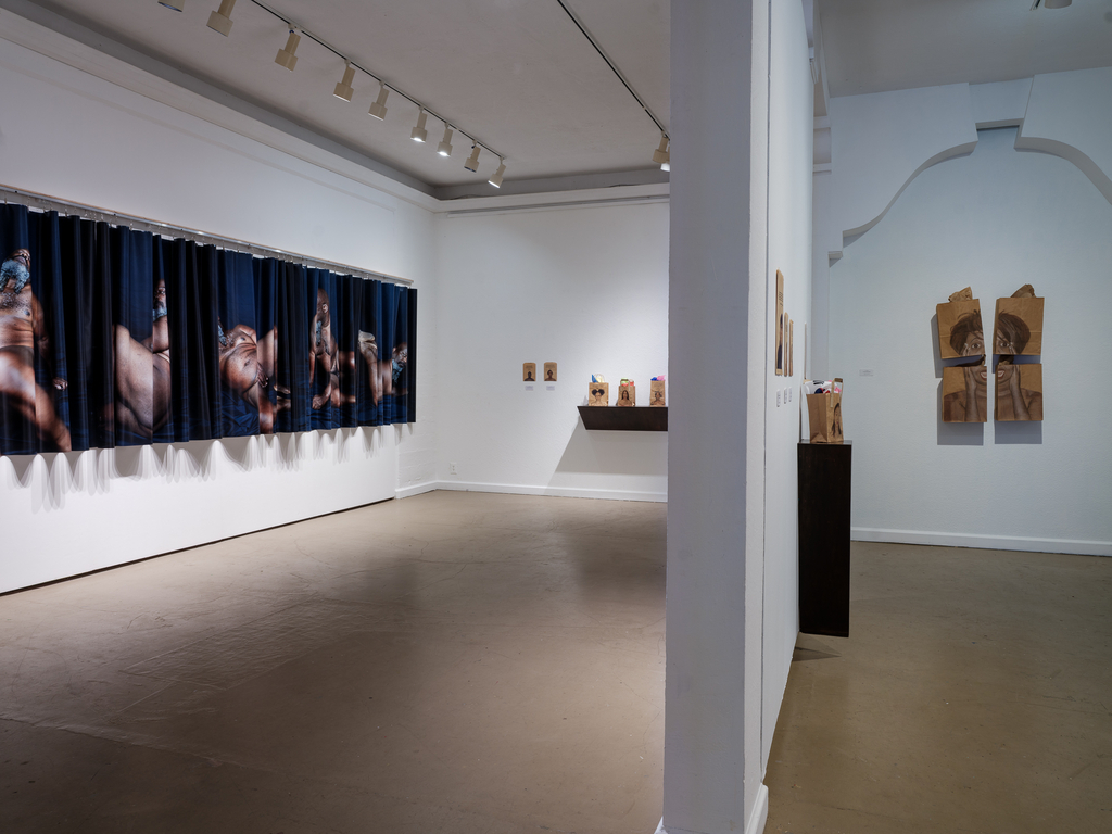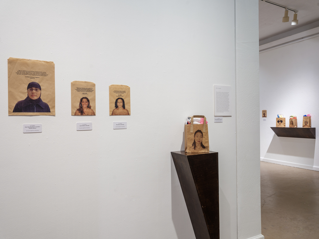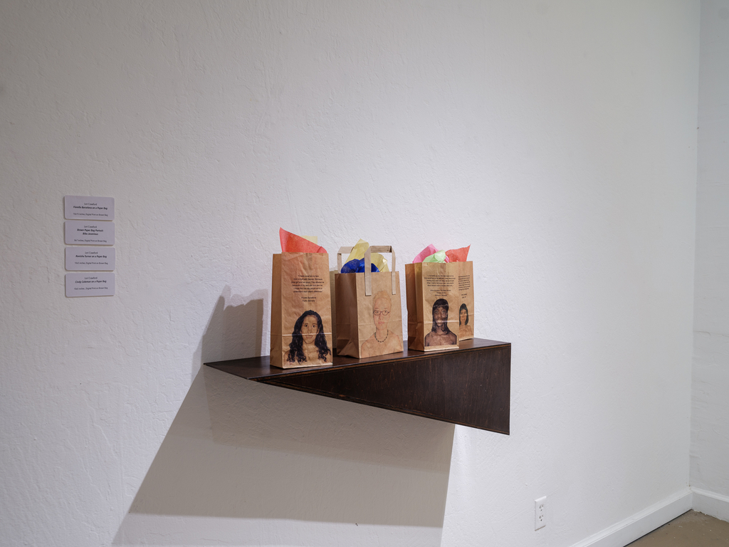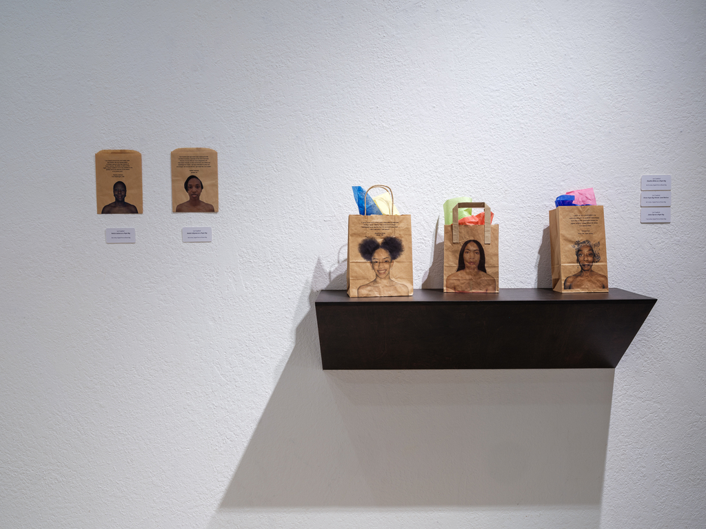 Skin tones are also central to Lori B. Crawford’s art, which features brown paper bags that reference a decades old practice, no longer accepted, within the African American community. Called the Brown Paper Bag Test, it involved comparing one's skin tone to the color of a paper bag to determine its acceptability.