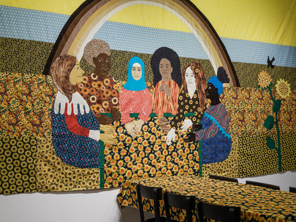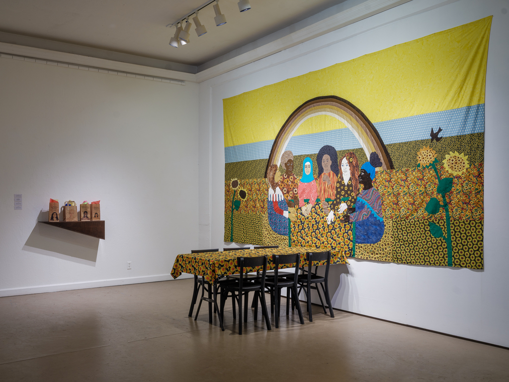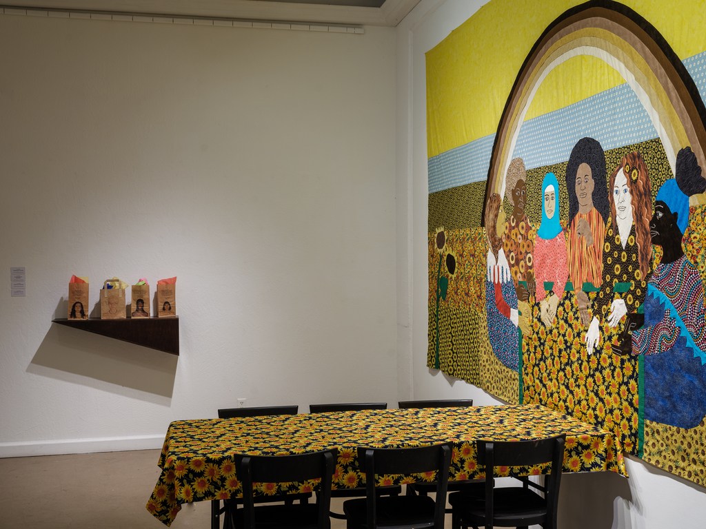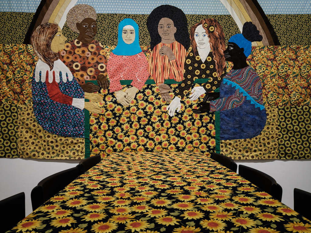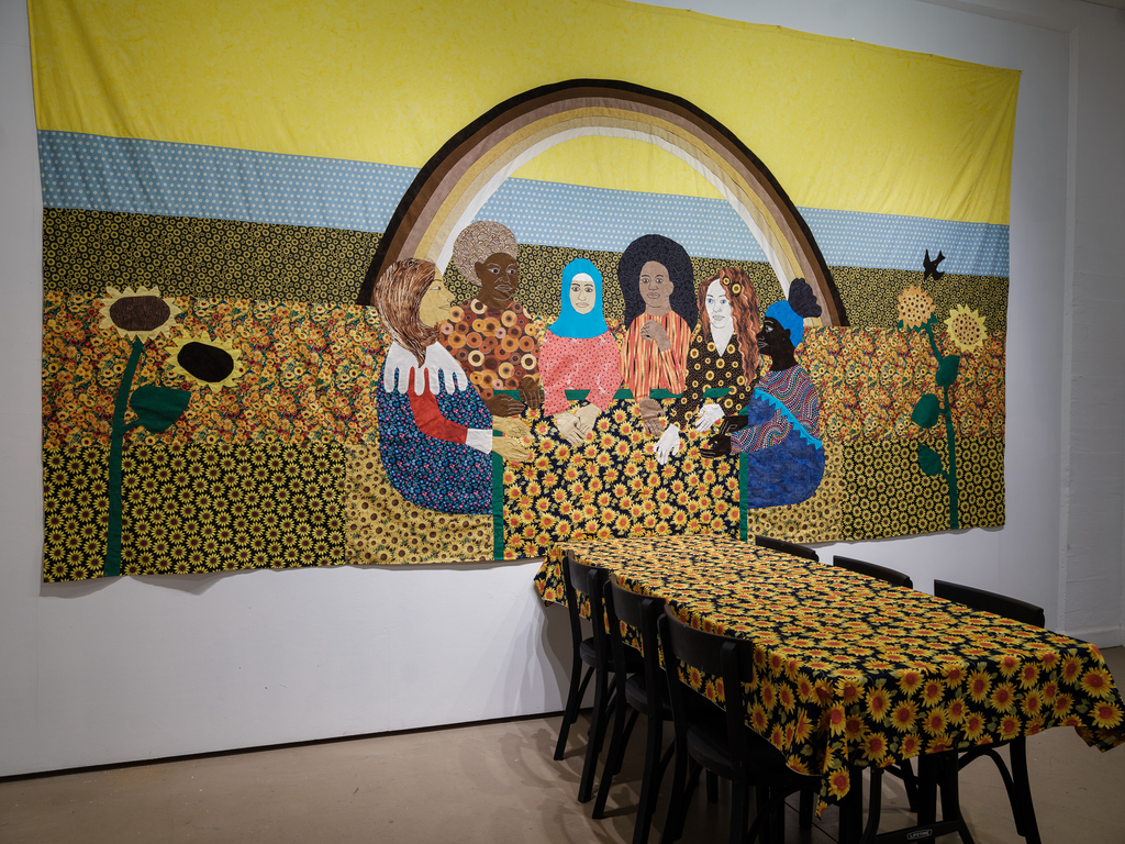 The textile collage “In Solidarity with Ukraine” by Oksana Briukhovetska employs different clothing styles and skin tones to envision women united before a backdrop of sunflowers, the symbol of Ukrainian resistance to Russian occupation.