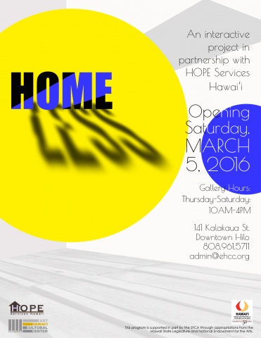 Welcome Home to our project gallery dedicated to asking the Big Questions of our time. For this installation, we explore the idea of “home” and conversely, “homelessness.” We conceived of this interactive project space in partnership with Hope Services Inc., Hilo’s biggest service provider for homeless individuals and families whose mission is to bring to life gospel values of justice, love, compassion and hope through service, empowerment and advocacy toward a world where those who face great challenges realize their value and self worth. In addition to this interactive installation, there are scheduled public programs and arts workshops to further explore these burning questions.