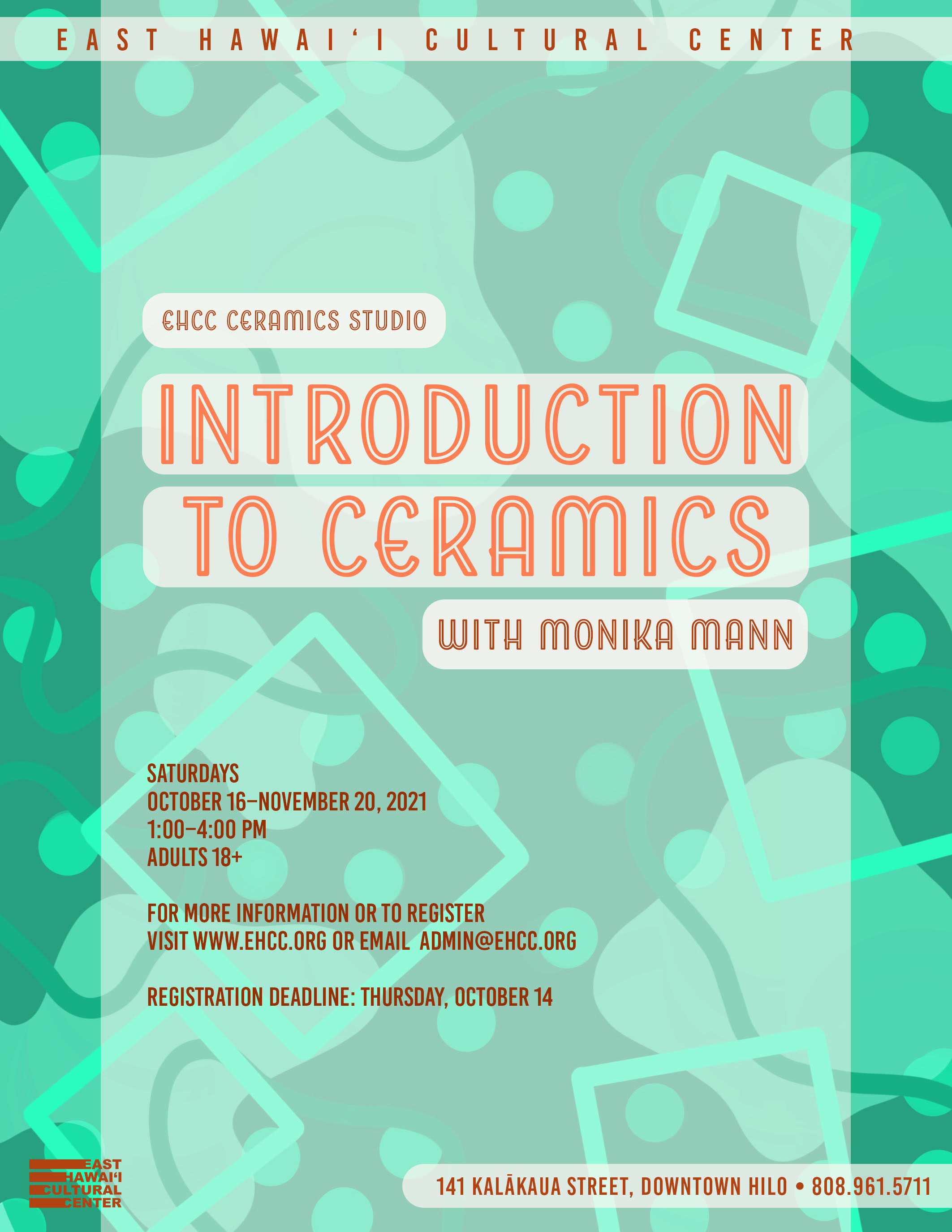 -Class fee for EHCC Members $175 + $50 Supply fee (all materials included: clay, glazes, firings) = $225.00