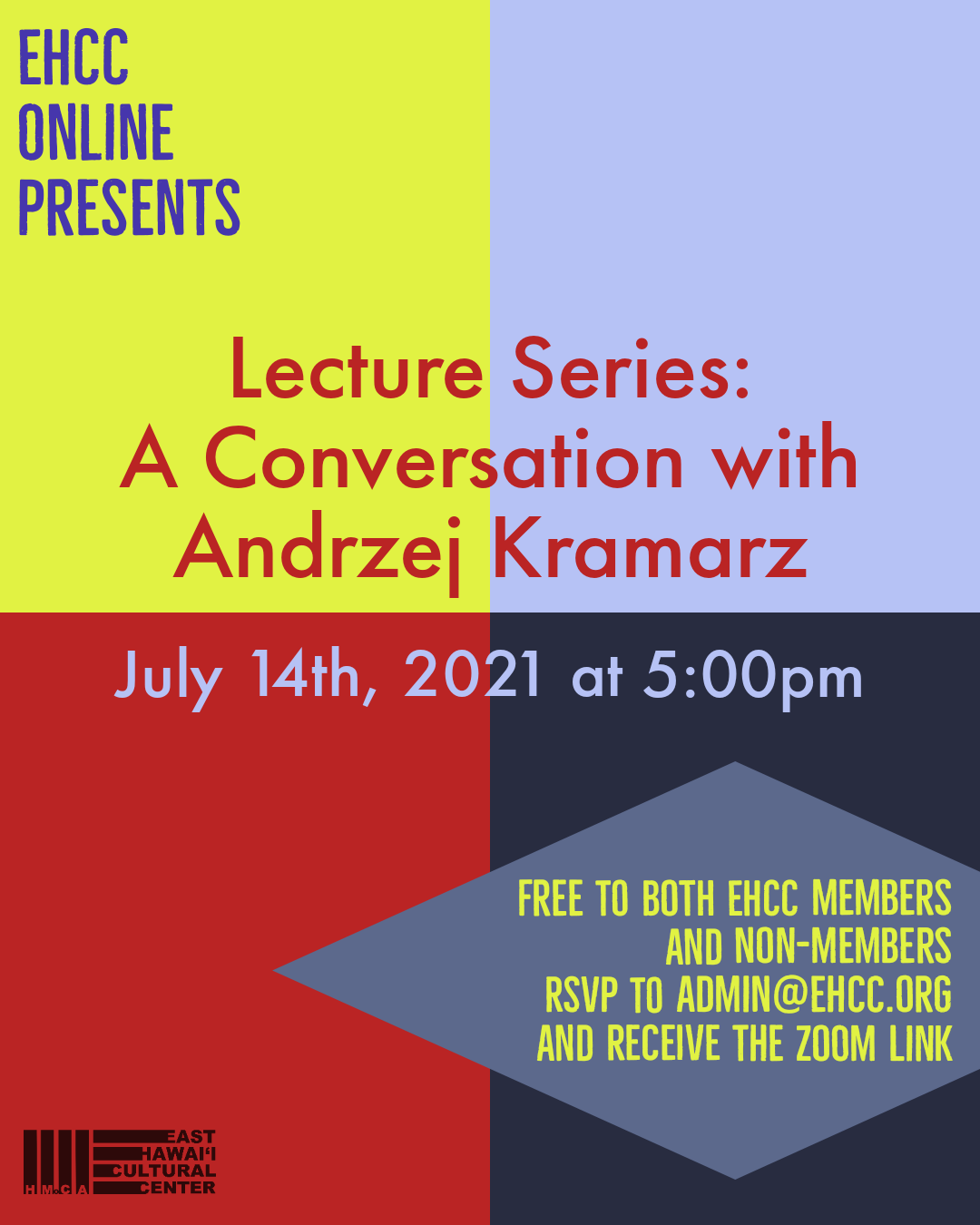 Photographer Andrzej Kramarz, EHCC’s gallery director and curator, has had a fascinating journey. Author, teacher, publisher, curator, and radical arts activist as well as accomplished artist in his native Poland, he has brought those experiences here to Hawai’i where they continue to feed his ideas, his art, and his exhibitions at the EHCC. Please join us for an illustrated Zoom conversation between Andrzej and Larry Butler at 5:00 PM on July 14. It promises to be as intense and surprising as he is.