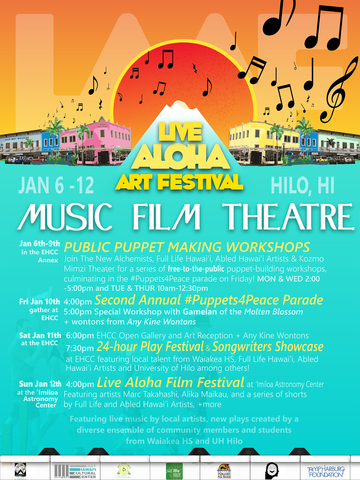 Featuring live music by local artists, new plays created by a diverse ensemble of community members and students from Waiakea HS and UH Hilo, a short film festival, puppetry, visual art, and conversations that build community by celebrating the rich and complex identities of Hilo’s residents - all programs of the Live Aloha Art Festival will be offered free-of-charge.