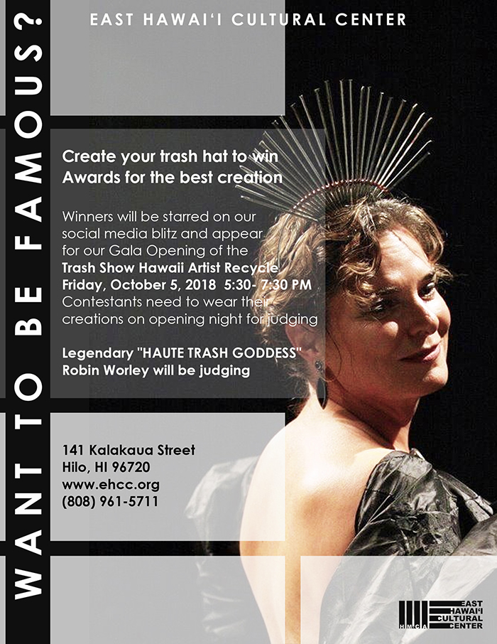 Ira Ono, founder of “The Trash Show: Hawaii Artists Recycle,” will be returning to jury the 30th anniversary edition of one of East Hawaii’s longest-running annual arts events. The show runs from October 5-26, beginning with a gala opening on Friday, October 5, from 5:30-7:30 p.m., followed by a special dance performance, “My Empty Body is Full of Stars,” by the Prince Dance Theatre company, starting at 7:30 in EHCC’s upstairs performance space, (the gallery will close at this time).