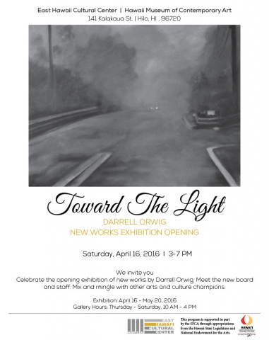 In a new body of work created within the period of March 2014 to March 2016, artist Darrell Orwig brings us inside a personal vortex of psychological trauma, caused by an event that changed his life forever. The accident, and loss of another man’s life, became the moment when time stopped, and darkness took over like an ominous claustrophobic shroud. The act of painting was the best way to cope and transfer the emotion of this tragedy. Toward the Light reveals twenty-five works organized by four periods, in the artists’ on-going process of healing.