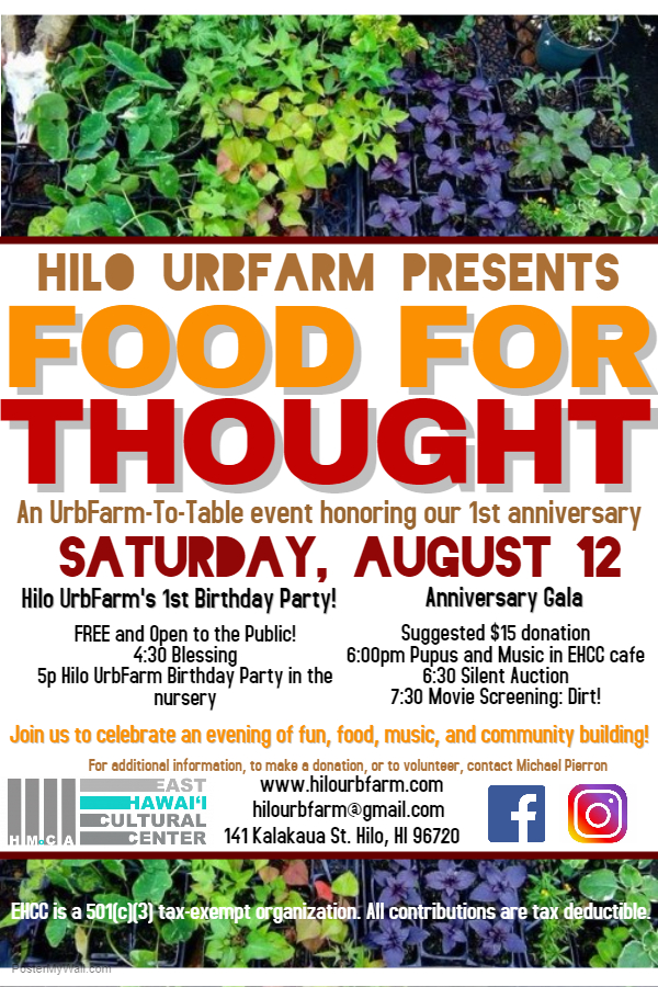 Join us for an evening of food, music, fun, and community building. The UrbFarm will have an open house party in on he nursery, then will switch gears to the first anniversary gala in honor of our partnership with the East Hawaii Cultural Center.