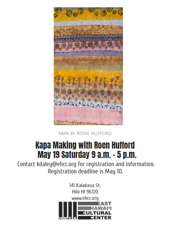 The kapa workshop will include all the supplies, wauke that Roen grows in Waimea, and the kapa paper/cloth that you make. The kapa process requires a lot of beating, so you can expect a fair amount of physical exertion.