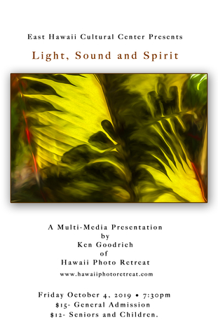 Light, Sound and Spirit will show on Friday evening October 4th 2019 from 7:30 to 9:00 p.m. at the East Hawaii Cultural Center in the Kahua ‘Elua Theatre. Prices are $15 for general admission, $12 for seniors and children- tickets sold at the door, no pre-sale.