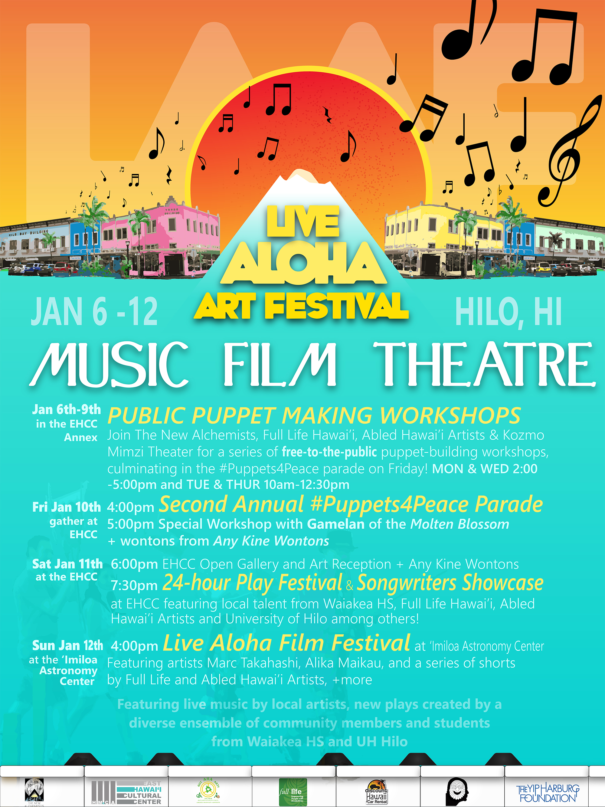 Featuring live music by local artists, new plays created by a diverse ensemble of community members and students from Waiakea HS and UH Hilo, a short film festival, puppetry, visual art, and conversations that build community by celebrating the rich and complex identities of Hilo’s residents - all programs of the Live Aloha Art Festival will be offered free-of-charge.