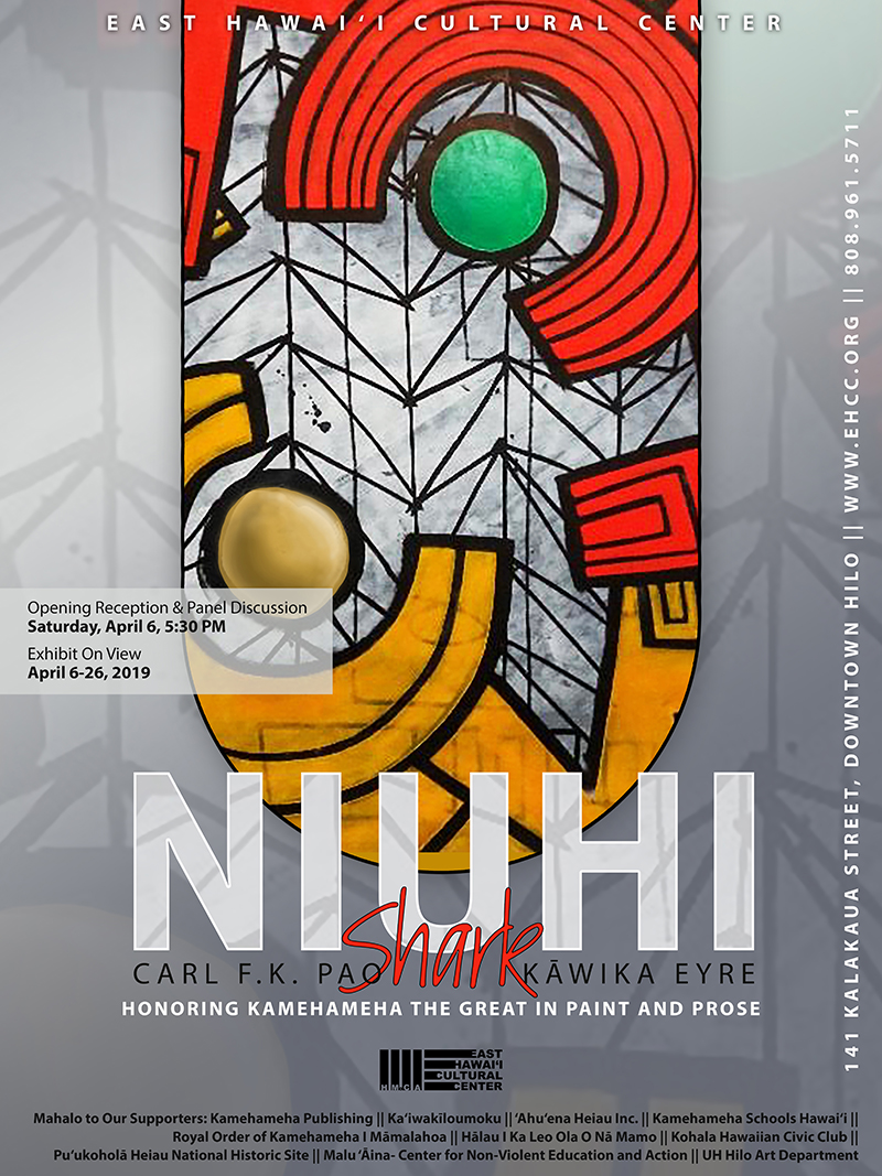The Volcano Art Center was the debut host of the exhibition, NIUHI-SHARK: Honoring Kamehameha the Great in Paint and Prose during the month of March. The exhibition will expand its collection and move to the EHCC/HMOCA for Merrie Monarch Week, and will then possibly travel to the island of Oʻahu to be included in the Hawaiʻi Book and Music Festival.