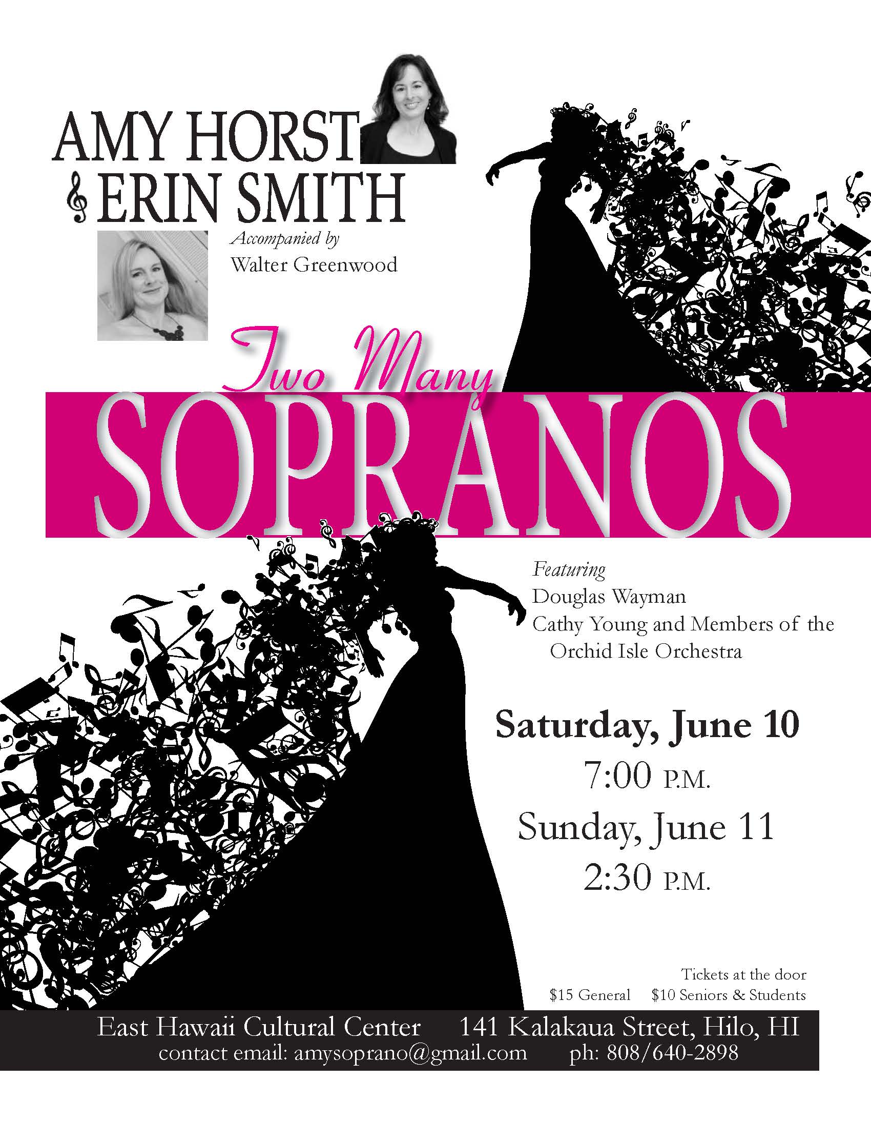 The vocal duo Two Many Sopranos, consisting of singers Amy Horst and Erin Smith, will bring their unique interpretations of classics and new favorites to Hilo. The duo's pianist is Walter Greenwood. Joining them are Douglas Wayman, Cathy Young, and members of the Orchid Isle Orchestra.