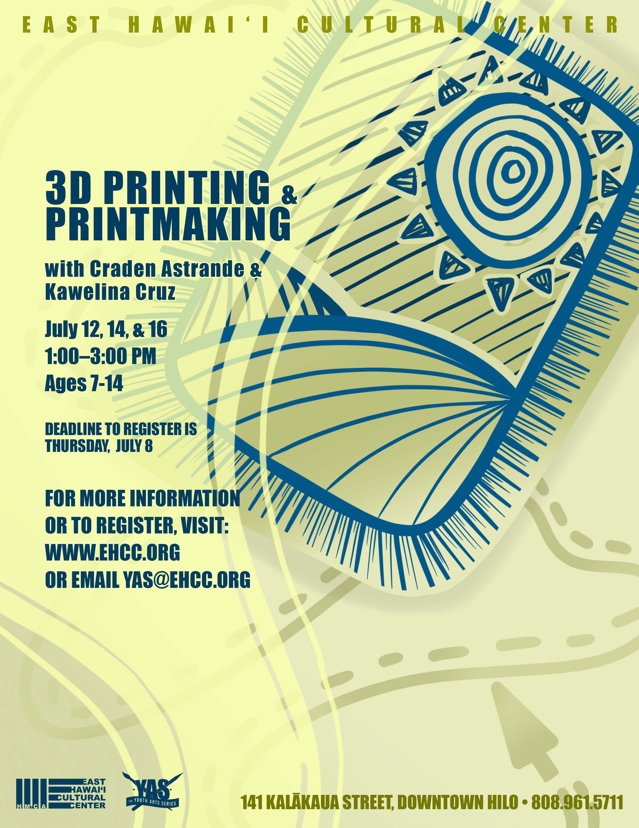 This unique class is a fusion of technology and traditional fine art media. Students will design and create their own printmaking tools using 3D printing technology. Class includes design principles, learning to use a 3D printing software program, and creating images using a traditional printing press. Students will work with Craden to create their own block printing plate and detail stamp. On the last day of the program (Friday, July 16), students will have the opportunity to put their tools to the test. Kawelina will guide them through the inking and printing process with EHCC’s in-house printing press. Students will keep their self-designed block printing plate and stamp to use over and over again!