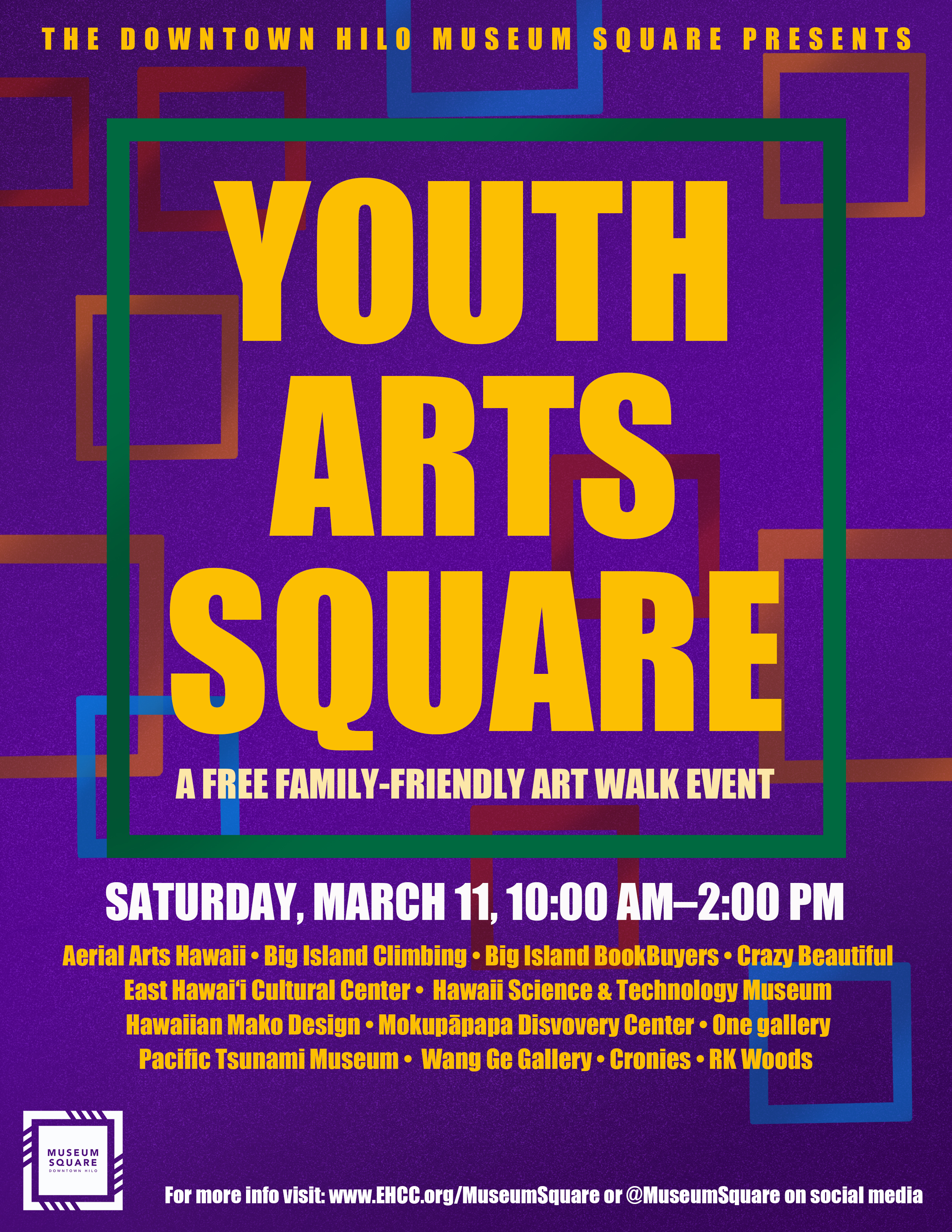 The Downtown Hilo Museum Square presents a family-friendly Art Walk in celebration of Youth Art Month and the 35th Annual Young At Art Exhibition. Join us on Saturday, March 11, from 10:00am-2:00pm for free art activities, art demos, discounts, giveaways and more!