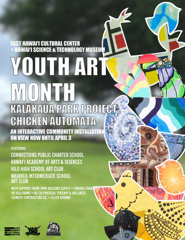 Additional project partners include Hilo High School Art Club, Connections Public Charter School, Waiakea Intermediate School Art Club, and Hawai‘i Academy of Arts and Sciences. Each of the school groups has taken part in the project by decorating one of the five chicken automata. The students in each group have been given the creative freedom to design their chicken in a unique way that best represents their organization.