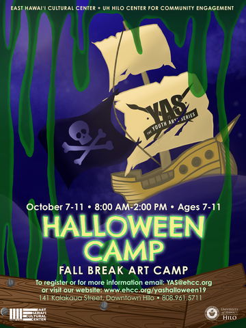 The Fall Break session of the Youth Arts Series is presented In Partnership with the UH Hilo Center for Community Engagement (CCE). YAS: Fall Break 2019 will feature a Halloween theme. Students will participate in 4 classes each day throughout the week, all fitting our holiday theme. Through our fun and creative classes, students will learn a variety of art-based processes and techniques including mask making, DIY decorations, monster sculpture, and dance.